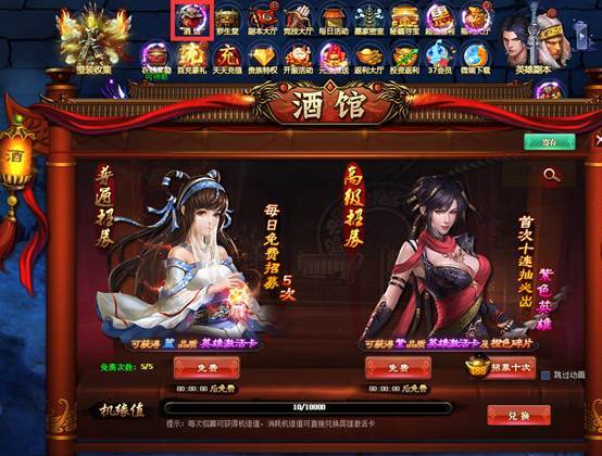 点击主界面上方的酒馆按钮,即可进入酒馆招募的界面,这里便是获得这些英雄角色的地方,酒馆招募分为普通招募和高级招募两种,普通招募每天有5次免费机会,高级招募每隔20小时有一次免费的机会。