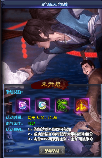 玩家进入场景后击杀四个角上的矿场守卫,守卫被击杀后掉落金矿,第一个拾取金矿的玩家将获得运输权,正在运输金矿的玩家可以被其他玩家攻击,如果运输玩家被击杀,金矿落地,下一个拾取金矿的玩家成为新的运输者。